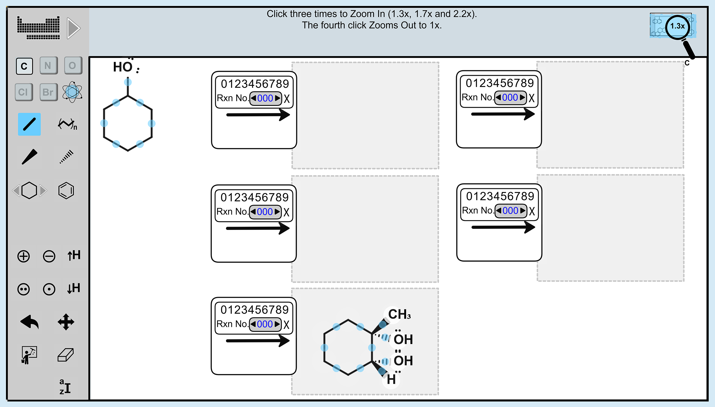 Multiple Answers (ordered) - Students draw the product structure after each step of an organic synthesis. To be graded as correct, the structure must have at least one atom within the reaction arrow's gray box. The Reagents can be placed above, below, or beside the reaction arrow, which can point in any direction - resonance arrows are also supported.
